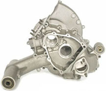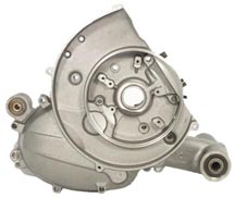 Small Frame OverviewThe small frame casing was retrofitted to be able to carry an electric start function similar to the large frame system. The difference is that the starter motor runs straight through the casing to connect to the flywheel ring gear. The only different parts that consititute the electric start system are the cases, the starter motor, and the flywheel. Everything else within the motor is the same as a non electric start motor. The cases: Standard small frame cases are shown