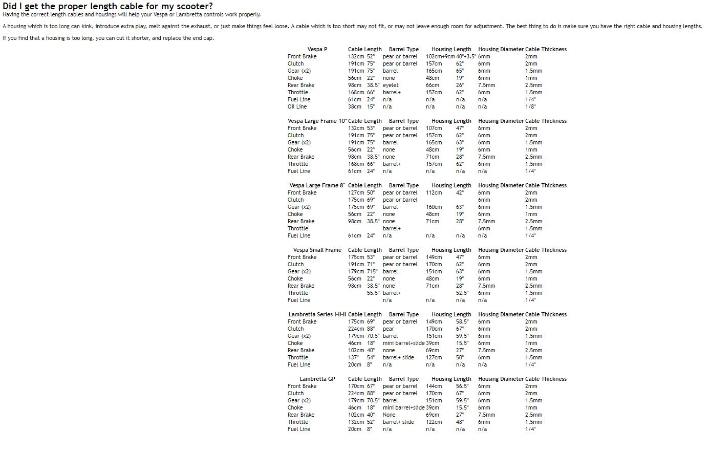 Replacing CablesVespa Clutch Cables - Non P Series Vespa Gear Cables - Non P Series Front Brake Cable Rear Brake Cable Speedometer Cable Vespa Choke Cable - Non P Series Resources |