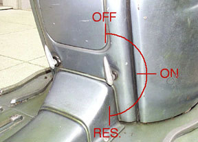 fuel valve from off (up), to on (sideways), to reserve (down).
