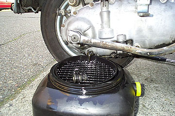 Once this is done, refit the upper sight hole allen head cap bolt with a new felt washer and tighten down the filler bolt. Take the bike for a spin and once things get hot, make sure there are no leaks. Lastly, please dispose of your oil responsibly. It can be extremely harmful to the environment if simply dumped. Most recycling centers will take it for no charge. Next Section --> |