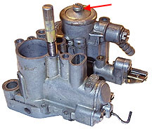 Above is a typical 200cc Vespa carb with the filter location noted with a red arrow. Unscrew the single screw to gain access to the internal fuel filter.