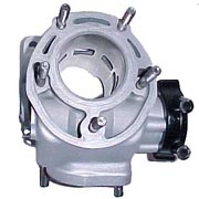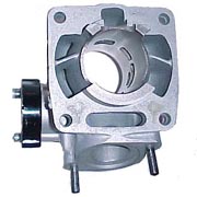 Some issues involved in adapting this to a scooter are that the powervalve actuator is on the right hand side of the barrel which would be problematic for a Vespa. Maybe it could be mounted to have the exhaust exiting toward the rear of the scooter which would make the powervalve actuator stick out to the right. Also the watercooling comes off the crankcase without a separate barrel intake as far as I can see (see the latge oval hole in the gasket face just under the exhaust). Intake would have to be through the crankcase as there is no barrel mounted intake.