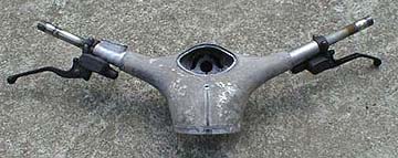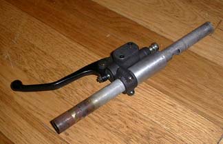 Hydraulic Headset:I wanted to create a headset that was as close to the original but with both a hydraulic clutch and front disk. The first problem was how to mount the front disk handlebar unit and allow the throttle tube to turn without the hydraulic reservoir unit turning. I could have used a "quick action" throttle but I think it would look to radical for this scoot.