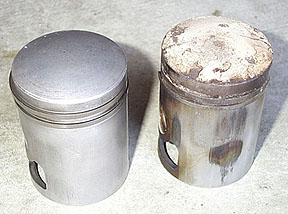 On closer inspection, it looked like the original piston had fractured at the upper ring pin and lost the entire upper ring presumably through the exhaust port. This bike really didn't look as if anyone had worked on it since the dirt was extrememly thick all around the engine so I am guessing this is what caused it to sit unused for so long. The piston I got from SF Scooter Centre was used and had the usual carbon on the crown and small scoring around the exhaust port. I scraped off all the carbon with a scrap piece of wood and then polished it with metal polish. I removed only the high spots in the piston scoring with 400 grit emery paper. New and old pistons are shown below