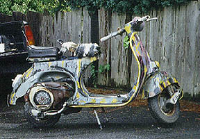 Why people decide they can paint an old Vespa with a brush I'll never understand.... I started by locating the basic bits for the bike such as an entire 10" fork from a GS150 which was before I realized that I could simple change out the hub of on set of 10" forks into the 8" fork body. I also managed to find a P200E engine in bad condition to provide power. The engine was from England and had no oil injection so the bike is still a pre-mix. Next Section --> |
