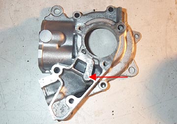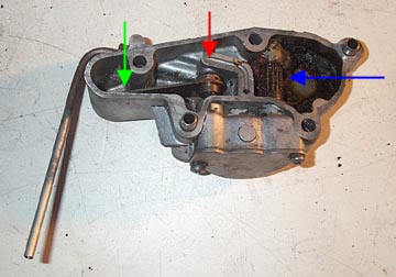 of the crank (blue arrow), and a small tunnel where the oil is pumped