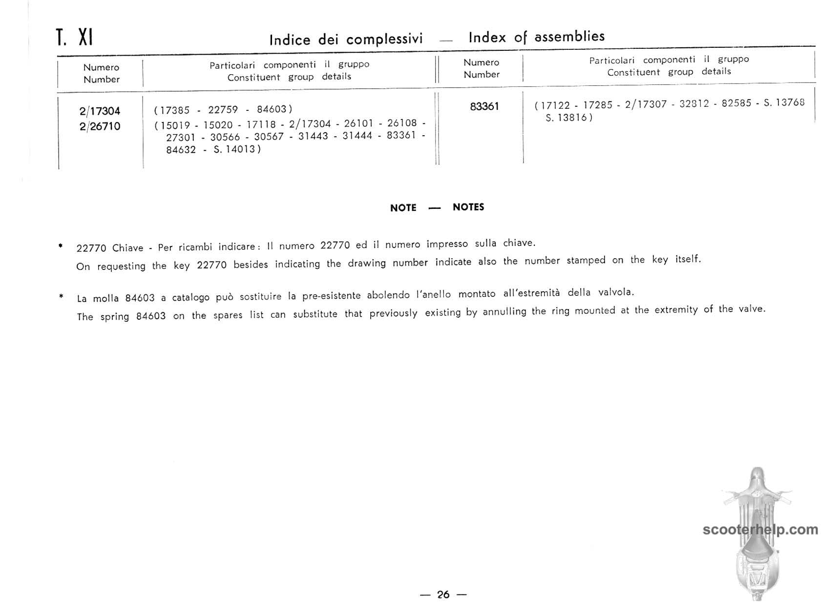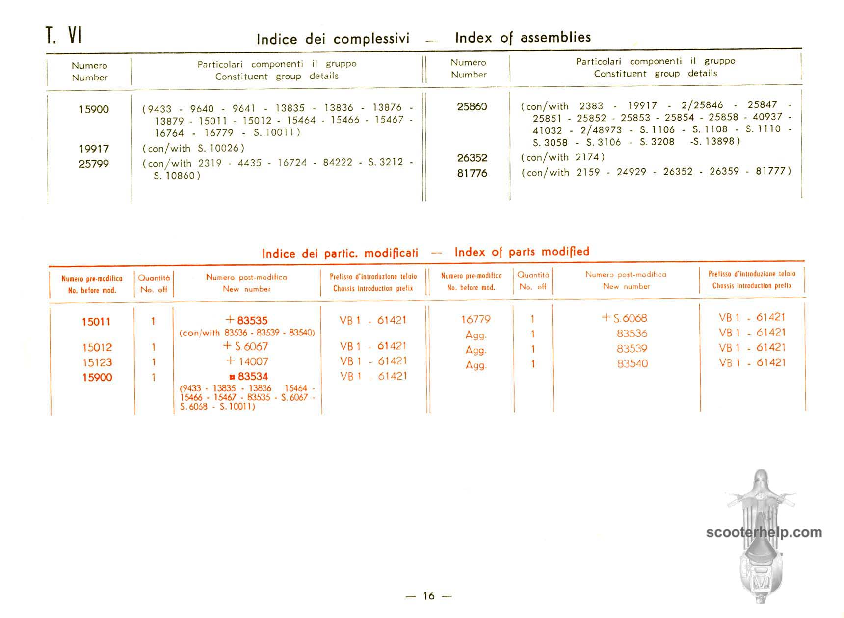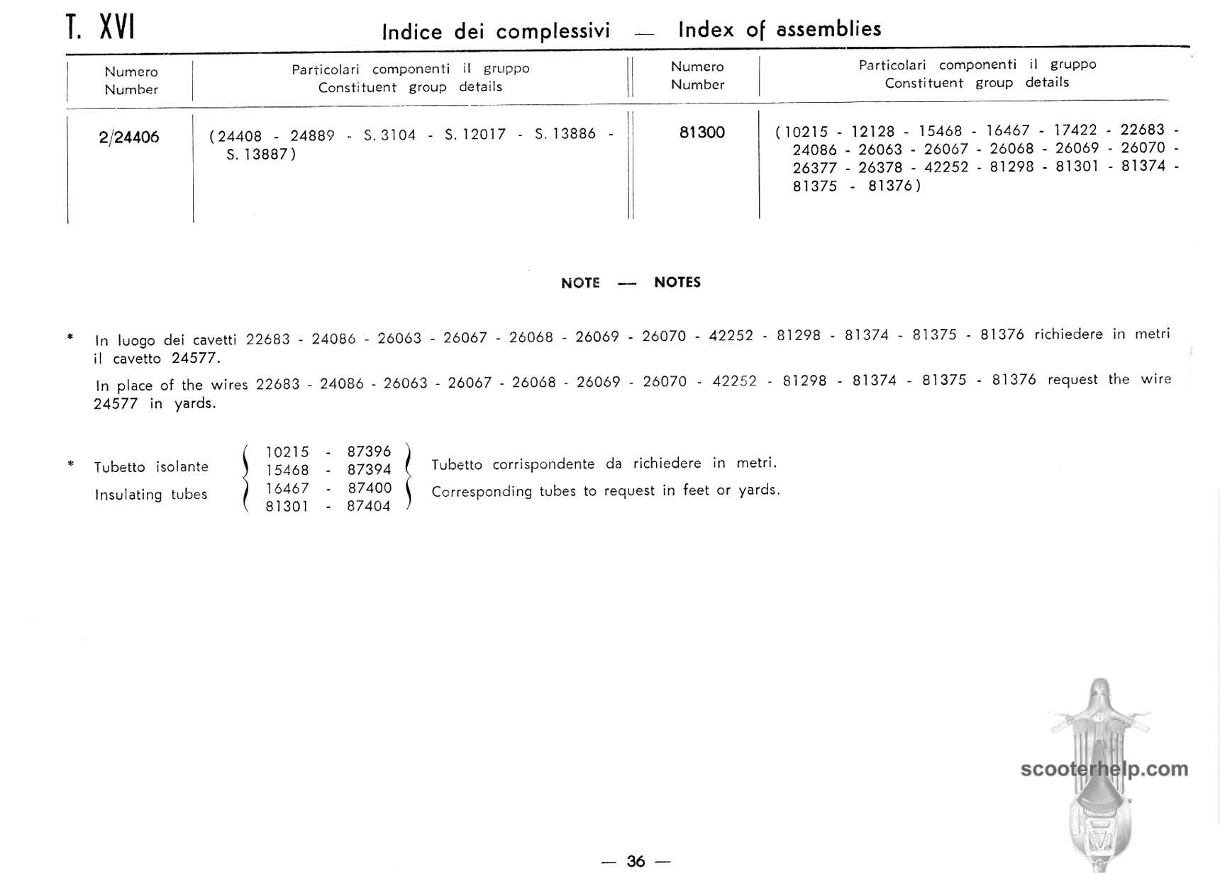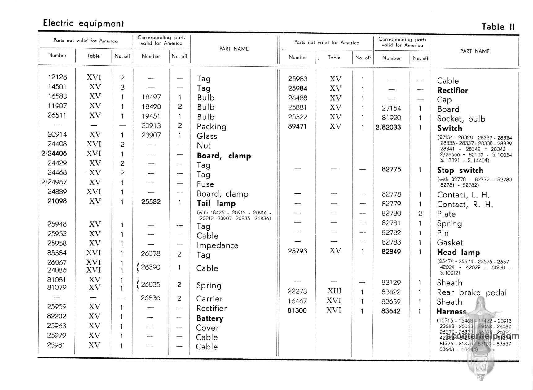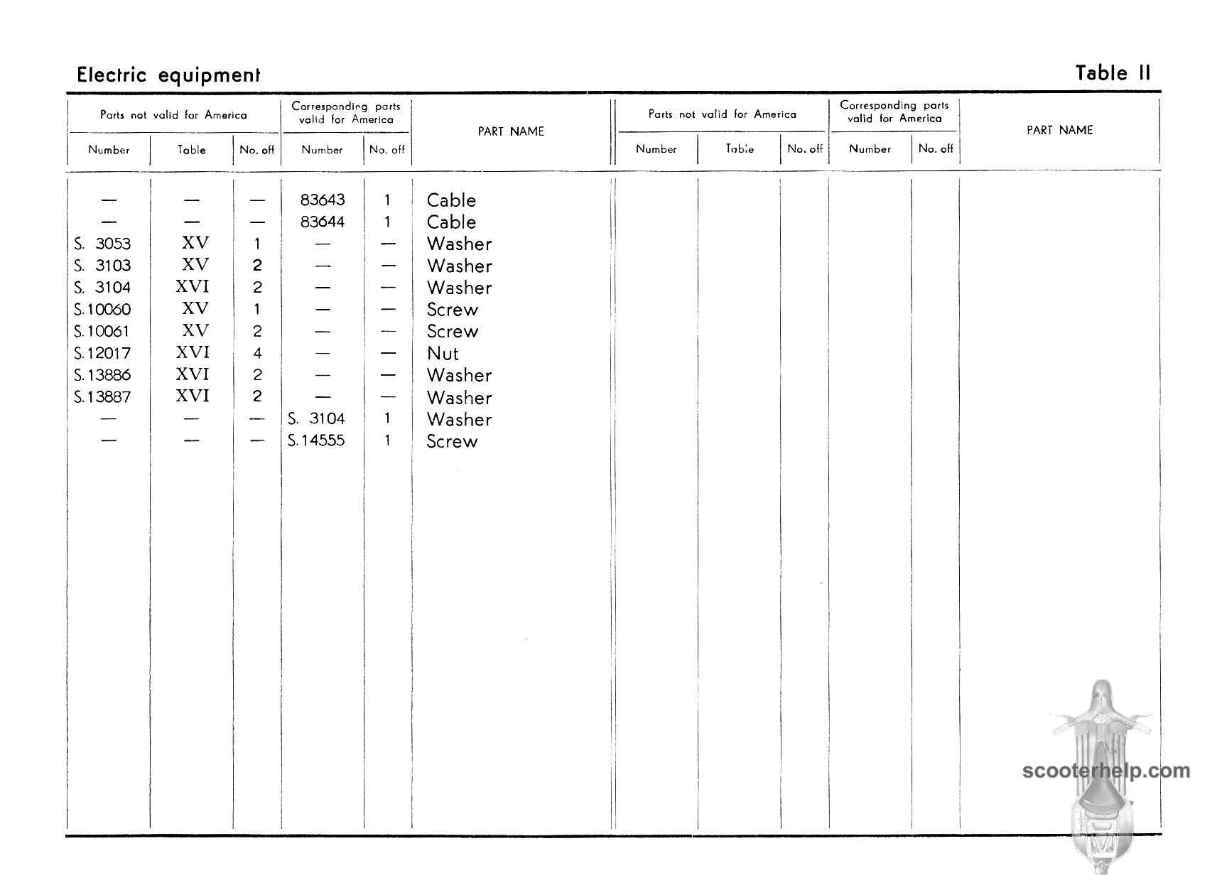 Vespa 150 (VB1T) Parts BookClick individual pages below for a 8.6"x 3" 200 DPI page. These are from the original Vespa parts book for service centers & shops - this one also includes the American supplement for bikes sold exclusively in the USA. Files sizes are about 500K for a color page and 350K for a black and white. Thanks to First Kick Scooters for the loan of the original manual. Or click here for a 6.8MB PDF file |