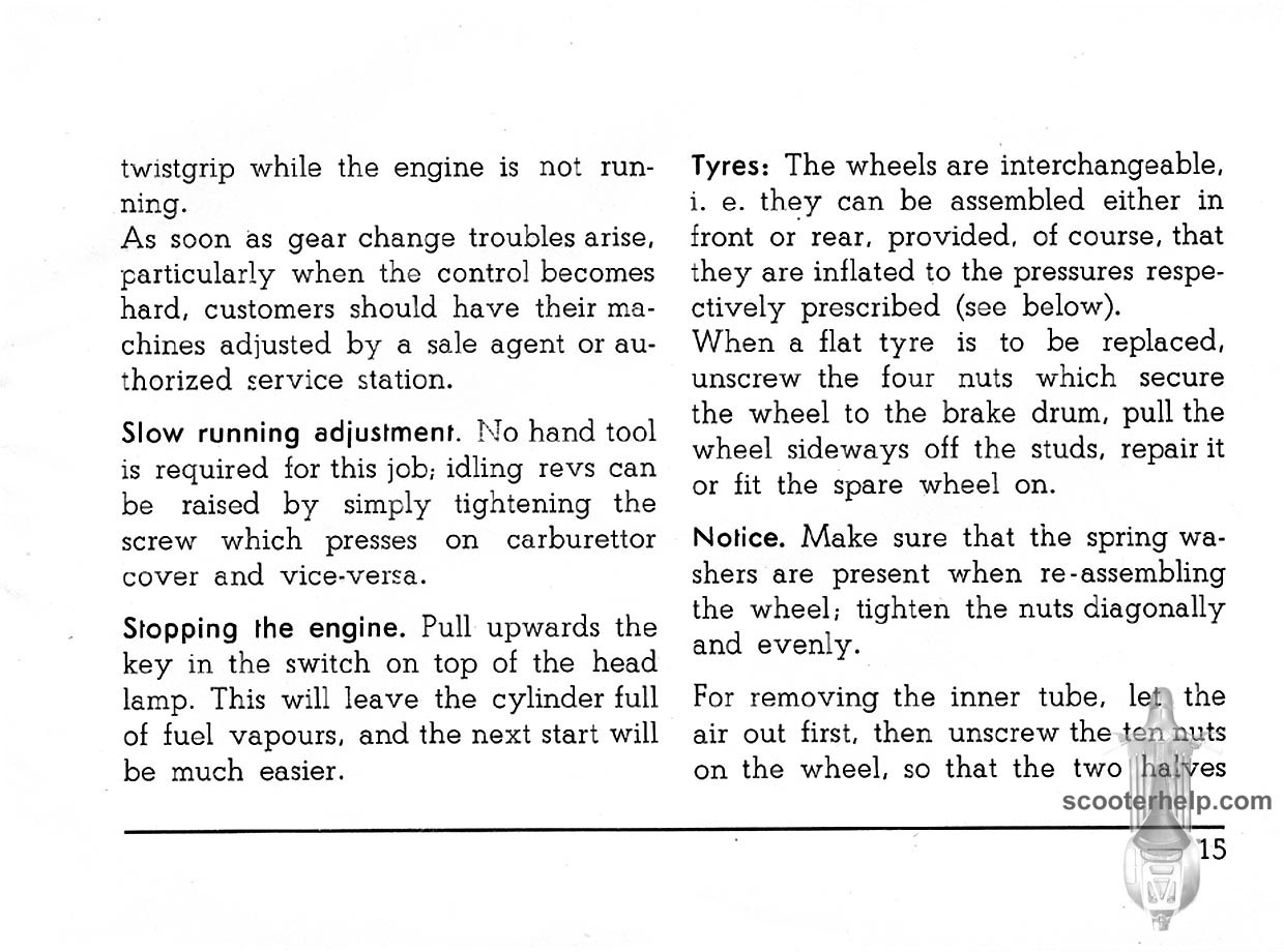 Vespa GS150 (VS1T) Owner's ManualThanks to Fredrik Rønning I now have an english copy posted. Click individual pages below for a 6.2"x4.6" 200 DPI page. Taken from the original owner's manual supplied with the Vespa GS150. Files sizes are about 250K for a color page and 180K for a black and white |