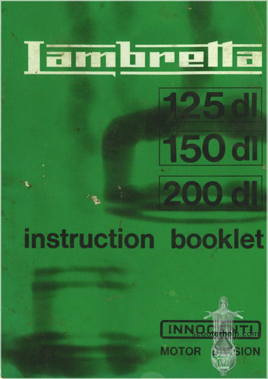 Lambretta DL125, DL150, DL200 (GP125, GP150, GP200) Owner's ManualClick individual pages below for a 6.4 x 4.6" 200 DPI page. Files sizes are about 180K for a color page and 110K for a black and white. Click individual pages for images or here for a high resolution 3.4MB PDF file. |