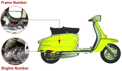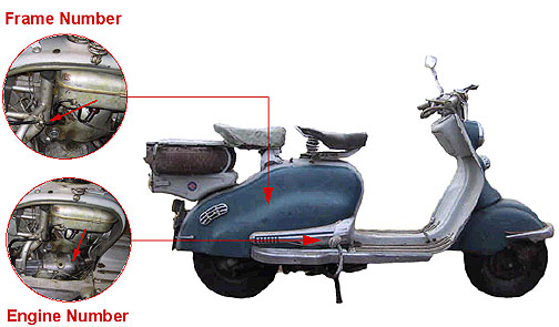Frame: The right side cowl must be removed to see the frame serial number. It is stamped on the main tubular part of the frame under the gas tank. The number will start with a prefix (ex. 150LI) which denotes the model, then a star and a 6 digit number with a star at the end which denotes the year. A typical frame number may look like this: 150LI*123456* Engine: Look on the engine casting to see the engine serial number. It is stamped on the cast aluminum swingarm right the gear change linkage and clutch arm. If you are unsure where the clucth arm is, pull the clutch lever on the handlebars and you will see it move. The number will start with a prefix (ex. 150LI) which denotes the model, then a star and a 6 digit number with a star at the end which denotes the year. A typical engine number may look like this: 150LI*123456*