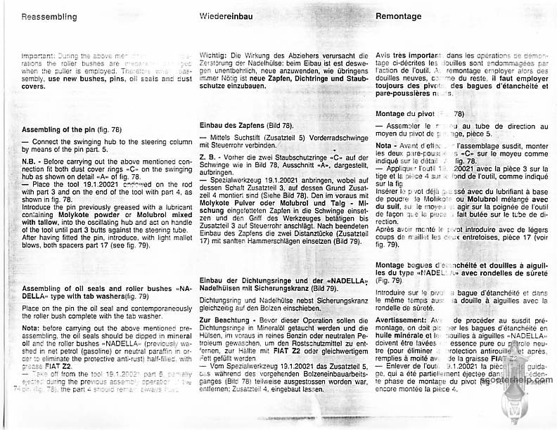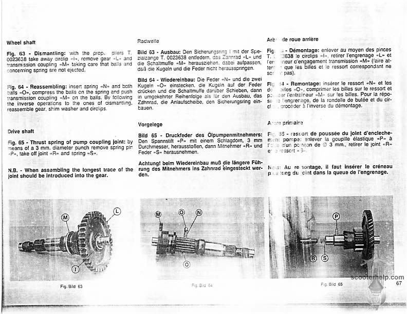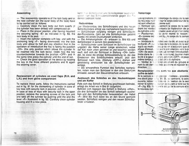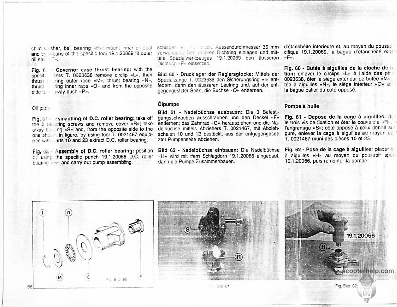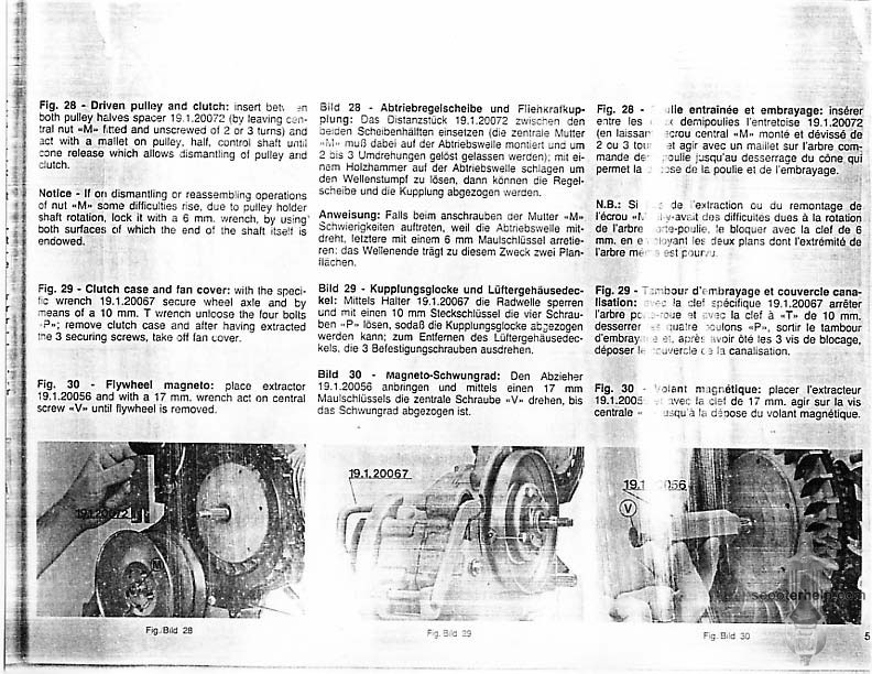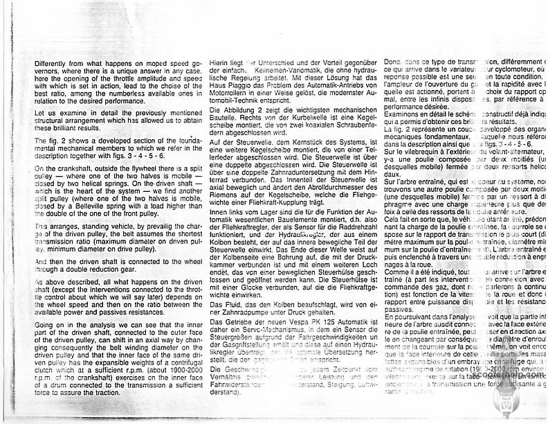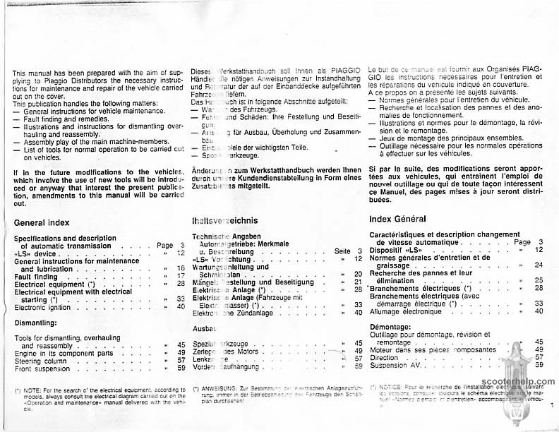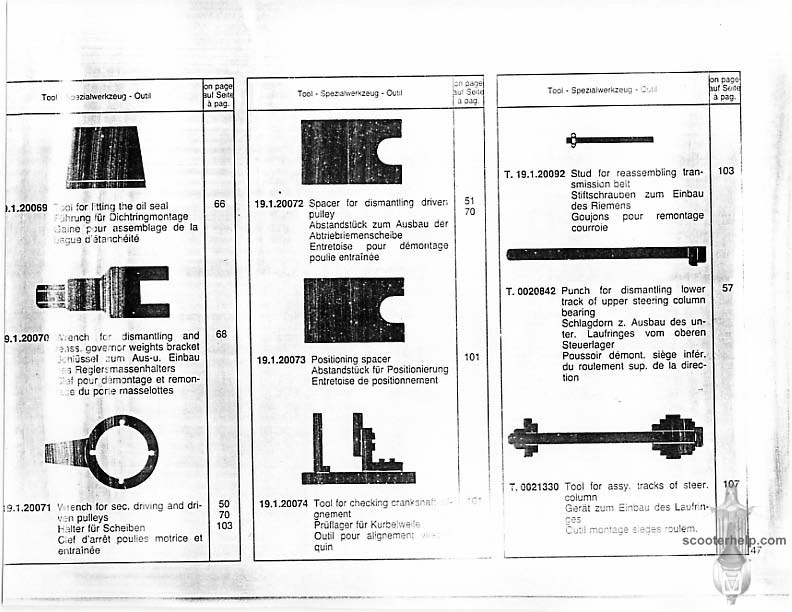 Vespa PK80S Automatica & PK125S Automatica Factory Repair BookThese scans are taken from the original service book which was distributed to dealers in the 80s. It shows some maintenance information, a quick guide to disassembly, and various pages of tolerances and electrical diagrams. It also give loads of electrical information and testing options for the ignition system, and shows many cool factory tools that were available to repair shops. Click each thumbnail for a 150 dpi image. If you prefer a PDF file of all the pages click here for a 13.2MB file download. |