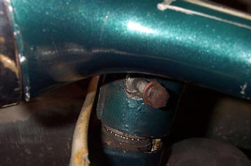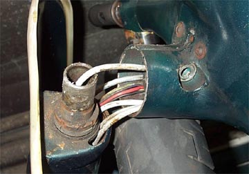 The front brake cable has to be completely removed from the front hub. Use an 11mm wrench or socket to loosen the pinch bolt on the steel cable inner. Once loose pull the cable out of the hub mounted screw adjuster so that it is hanging down from where it emerges from the fork tube. My bike was missing the speedo cable when these shots were taken so it is not shown. It can remain in place and be dealt with at the top end.