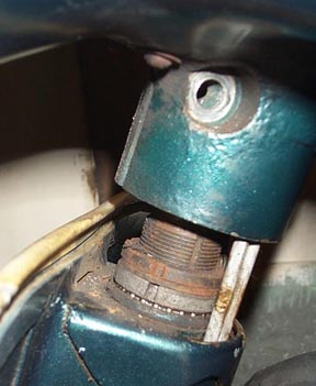 Before removing the final lower retaining ring you may want to stuff something into the control cable holes, and support the front wheel of the bike. Older bikes have uncaged bearings at both ends of the fork tube, which means they may come rolling out all over the floor. Usually there is enough grease still in the bearing race to hold them in place. I changed mine to a P200 upper bearing race when I put the bike together. The P200 ones have a cage around the perimeter that hold the ball bearings in place, but alow their outer surface to roll against the bearing races. To loosen the lower retaining rindg, use the same technique used to remove the upper ring. The forks will probably start to drop as you do this, unless supported.