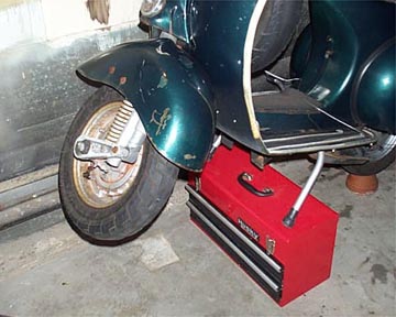 First set something under the stand feet that will raise the bike up. I use an old tool chest and then a something else (a flower pot) under the rear wheel. The idea is that the front wheel should be 18" or so of the ground to allow you to remove the forks.