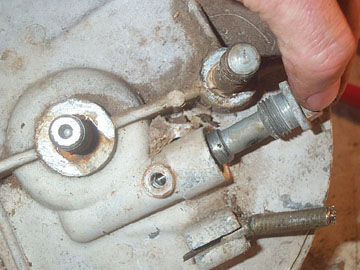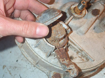 If you are planning on painting or powdercoating the hub you'll need to remove all the parts from it. Remove the small grease nipple from the speedo drive with a wrench. My cables were in such bad shape I simply cut the front brake cable because it was jammed in the hub...that's why it still shows in the picture.