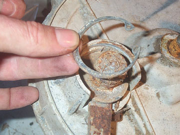 Once the disk is free the hub should come apart. Check the speedo drive gear to make sure the teeth are in good condition. Also you can clean up the three locator pins with steel wool if they are rusty.