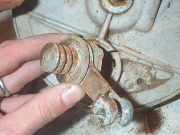The whole arm system should then lift out, although it may be stuck due to lack of use. Try a solvent to free it up if it is really loose and you plan to replace the disk pads anyway. DO NOT use a solvent if you are going to reuse the pads as it will ruin their effectiveness. The disk arm on my bike was blasted clean and greased up before reassembly. The way it works is very simple using ball bearings to force the actuating plate out when the arm is pulled.