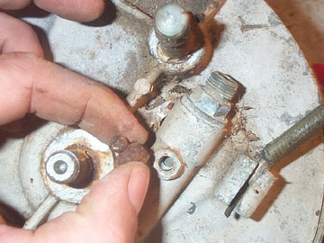 The static pad has a small adjuster shaft and lock nut. Remove these (mine came off in one) and set aside. If yours comes off in one, use a vice and an Allen wrench to separate them as they are used to adjust the disk brake in the future when the hub is put back together.
