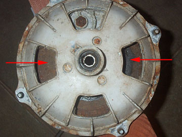 The original disk brake was cable operated and had a static inboard pad and a operable outboard pad. The disk in the center of the hub was able to slide on three pins and the outboard pad would push the entire disk until it was clamped between the inboard and outboard pad. Click here for an exploded view of the parts involved