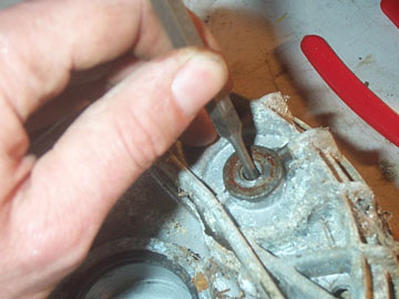 Pry out the grease seal. and be sure to replace it with a new one during the rebuild. Be careful not to damage the speedo drive while levering it out.