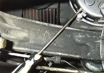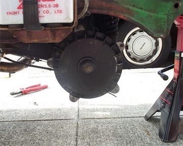 With the jack stand in place and the bike still on the center stand it is easier to get the clearance to get at the clutch cover. The cover is located just above the rear wheel hub and has a small arm and spring coming out of the bottom of it.