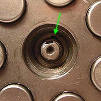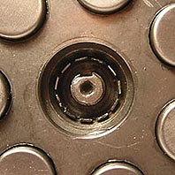 With the center plate removed, the nut and retaining washer are now clearly visible. The way the retaining washer works is that it has many metal tabs around the perimeter, and a single tab in the center which slides into a slot in the crankshaft. When the castelated nut is torqued down, one of the tabs will usually line up with a 'valley', and is bent into the lower part of the castelated nut. This stops the nut from loosening under turning from the crank and/or clutch.
