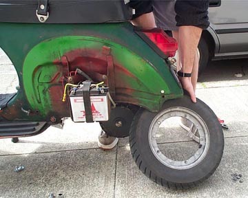 The first step is to get the bike up on the main stand and put something like a milk crate, 2x4, or a jack stand between the tail of the frame and the ground. You need something just long enough to allow the rear wheel to spin freely. On a P200 the plastic tail bumper is a snap fit and can be removed before taking the weight of the bike on the tail. Remove the five 13mm wheel rim nuts on the right side of the rear tire (battery or glovebox side) to remove the rim.