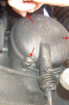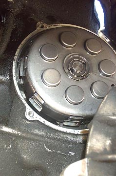 If your bike has seen some good use your clutch cover will look somewhat like the one pictured above. It is a good idea to run a rag over the area where the clutch cover seals against the crankcase to make sure that no grime falls into the transmission. To remove the clutch cover you'll need a 10mm socket and driver. Do not confuse the end of the transmission input shaft as one of the bolts. It is located right on the side of the clutch cover and is much larger than 10mm. It is not necessary to disconnect the clutch cable from the clutch arm unless you need to replace or completely remove the clutch cover. Once the three bolts (arrowed above) are removed the clutch cover will come off with a small pull on the clutch arm, away from the casing. There is a small brass plunger which may fall out so be sure to save it for later.
