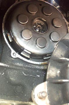 Above is a shot of the clutch with the cover removed. The clutch is actuated by the small brass plunger (which may or may not have fallen out of the clutch cover) pushing on the center plate of the bell housing. The center plate has a small bent piece of wire which secures it over the clutch retaining washer and nut. To remove it use a pair of needle nose pliers to push both ends toward the center of the plate.