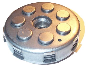 Clutch OverviewThe Vespa clutch has remained almost unchanged since the 60s. It is a basically a system of cork and steel plates running in the transmission oil, which is forced together by a series of internal springs. On large frame Vespas it connects directly to the end of the crankshaft, and on small frames it connects to the transmission input shaft.