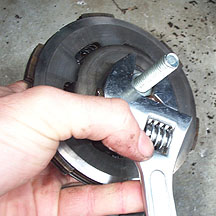 To compress the clutch you can either buy a Vespa tool or just head to the hardware shop and make one on your own. I use a large end washer, a 1/4" threaded bolt, and a smaller washer and nut. Make sure the larger washer is only making contact with the tough clutch body and not the sheet metal retaining ring as shown below. Thread it through the clutch and tighten it down with an adjustable wrench. This action compresses the central spring so that the plates can be removed and replaced.