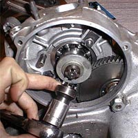 Use the flywheel side bearing you just removed as a spacer and make sure it fits directly over the inner race of the main bearing. Add a couple of washers so that only about a 1/4" of thread is showing.