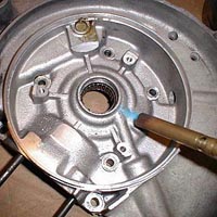Installing a crankThis section assumes that you have already split the casings and removed the old crankshaft from the main bearing. These pictures are all from a P200E engine and older models have a different bearing set up. The first thing you should always do is to replace the clutch side oil seal. This part is cheap but will cause you big headaches if you leave the old one in and it fails. Purchasing a new crank is pretty easy. Most scooter shops have them in stock and can fit the flywheel side race noted below for a small price. It is wise to change both crank bearings located in the crankcases if there is excessive play. The main bearing on the clutch side can be removed by taking off 2 nuts and tabs and a retaining clip visible once the oils seal is removed. It can then be driven out with a large socket of equal diameter to the outside race. European or non-autolube models have a large retaining clip instead of the tabs. The flywheel side bearing has 2 parts - an internal race which is tightly fitted to the new crankshaft and a caged needle bearing set into the flywheel side casing. To remove the casing side of the flywheel bearing remove the flywheel side oil seal (which should also be replaced), and gently heat the casing with a blow torch, shown below.
