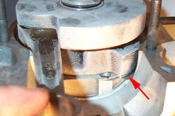 The easiest way to remove the bearing is to find a socket which is the right diameter to align with the outside lip of the bearing and hit it out in the direction of the crank with a hammer. Since this bearing will be going in the trash anyway you can also use a flat head screwdriver and tap around the outside lip. Be careful not to scratch the surface where the oil seal will be fitted. The new flywheel bearing can now be fitted by reversing this process and tapping the bearing in with a large socket or flat metal plate. An internal race must also be fitted to the flywheel side taper of the crank. This is an easy item for the scooter shop to fit when the crank is bought but it can also be installed with a large deep socket or correct diameter metal tube. Heating the race with a blowtorch makes installation very easy. Using the tube or socket slide the race down until it stops. At this point, lightly tap the bearing race on the crank. Heating the race will aid in this process. Make sure that the flywheel side crank web is fully supported or you will put stress on the crank pin and possibly distort a nice new crank. This race should not touch the flywheel, but be spaced of by about 0.5mm. Below is the race location on a new crank and the clearance on a dead crank.