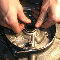 Fitting a new flywheel side seal is as simple as pushing the seal into place firmly with equal pressure on all sides as shown below.