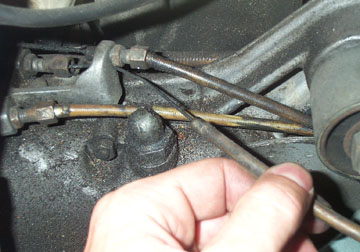 Move back to the adjuster block and pull the inner and outer cable through the adjuster block. Stuff the cables somewhere away from the engine or use a zip tie to hold them all out of your way.