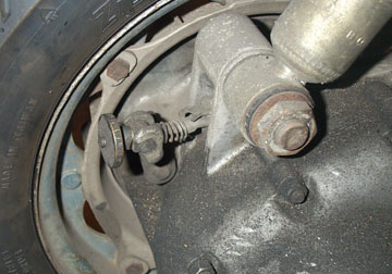 Find the rear brake adjuster just inside the rear hub. You can either disconnect the rear brake at the foot pedal under the floorboards, or remove the adjuster from the end of the cable as I did.