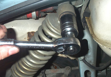 Remove the 24mm nut and washer on the upper and lower shock mounts. Once removed you may find that the shock is hard to get off. The trick is to pull each end just a small bit at a time so it comes squarely off the mounting posts. Once off the rear wheel will be able to hit the inside of the rear mudguard.