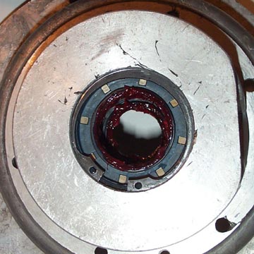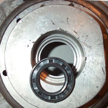 Now that the inner race is on we can move back to the mag flange. The outboard oil seal is the first to be put in place from the inside face of the mag flange. Above is a shot from the crank side of the mag flange. There is a small circular spring around the lip of the oil seal. This must face towards the crank once installed. The mag flange can be heated to ease the placement of the seal but you'll probably have to touch it with bare fingers to get the seal in so don't go heat it beyond what you can touch.