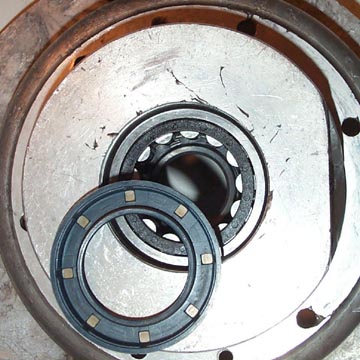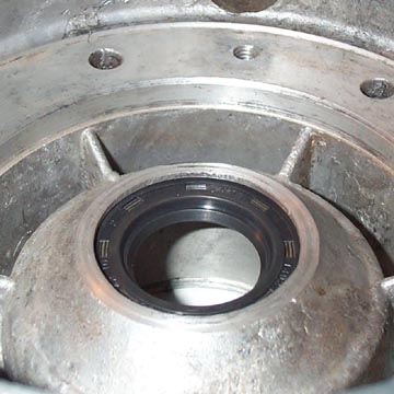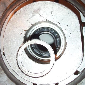 The inboard oil seal is fitted next, again with the spring and lip towards the crank. This seal is a bastard to fit but be patient and slowly force it in by hand. If required you can use a flat piece of wood to carefully bang it in place.