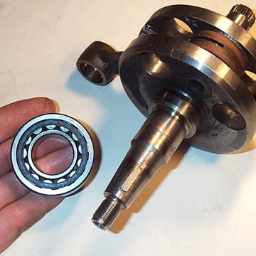 Above is a shot of the LI style crankshaft with a new flywheel side bearing. The bearing is a two part assembly. The outer part with the rollers in it goes into the cast aluminum mag flange. The inner part fits on the crank shaft itself. You will need to remove the previous race if it is still on the crank. I took mine down to San Francisco Scooter Center who pulled it off for me (thanks guys) because they are such a pain to get off. If you don't have access to the correct tool to remove it or don't have access to a scooter shop it can be done by heating it up and using vice grips, or carefully cutting it off but I don't recommend these approaches.