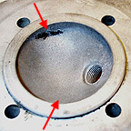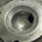 Vespa VBA head - a very domed chamber with small indentations (arrowed) to allow for the clearance with the deflector type piston. A small lip is also present. | ||||||||||||||||||||