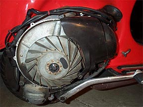 The first step is to remove the right hand side engine cowl to gain access to the motor. Remove the 4 flathead screws that hold the sheet metal flywheel cover to the main casing.