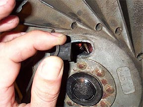 Next you need to make a pointer. An easy way to do this is cut about a 2-3" length of wire or an old coat hanger and bend it a hoop in one end. Bend the other end so that when it is mounted to the casing with a fan cowl screw, it will point accurately to the timing disk (see above).