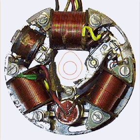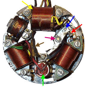 Above is a shot of a stator from a Vespa 150 (VBA1T). The red arrow shows the points which are two small circular faces that align with each other when the contact breaker arm (pink arrow) is closed The blue arrow shows the small off-set screw used to change the contact breaker gap which will be covered in the points timing section. The yellow arrow shows a typical AC coil for generating the power for the ignition circuit. The condenser is shown with a green arrow and can be easily and inexpensively replaced if necessary. The final important part to the stator is the felt pad which lubricates the flywheel cam as it passes on every engine revolution.