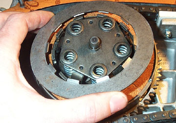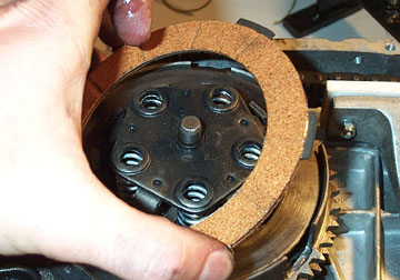 Fit the original upper clutch plate and make sure the springs locate in their top holes. Since the clutch is not yet compressed most of the plates in the following steps will not engage the clutch outer bell or inner clutch tabs. These can be aligned when the clutch is compressed later, but the order in which they are placed is important.