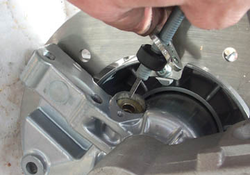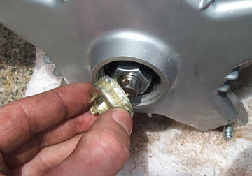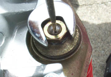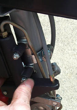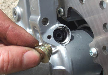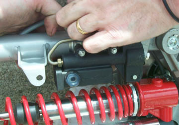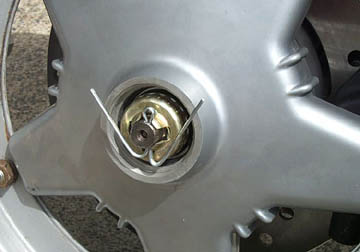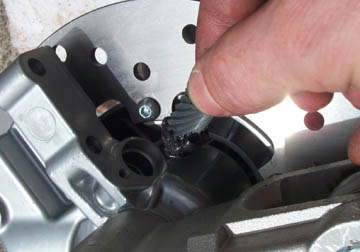 The final step is to connect the new brake cable to the lever and the master cylinder. Once it is connected at the lever end take up any slack in the cable. Install the return spring with the ends hooking the cable. Thread the cable over the nipple and tighten it down. With the bike on the stand, make sure the wheel turns without rubbing on the brake pads. Then try the brake and make sure it engages evenly and smoothly. From here, replace the rim and tire and take it out for a test drive. Next Section --> |