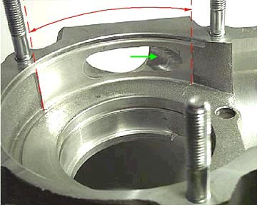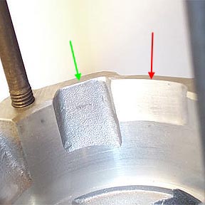 In the shot above you can see the machined contact area of where the crank web seals with very low tolerances against the casing noted in red. There is very little machined surface to either side of the opening and if you open this inlet out beyond the machined area the rotary valve will no longer function and neither will your engine. If you open it out the length you will affect the port timing and intake duration. Note: there is a machined area that looks almost like someone drilled it out from above at a slight angle towards the barrel. This is not someones previous attempt at tuning your casings - , it is standard (shown with green arrow).